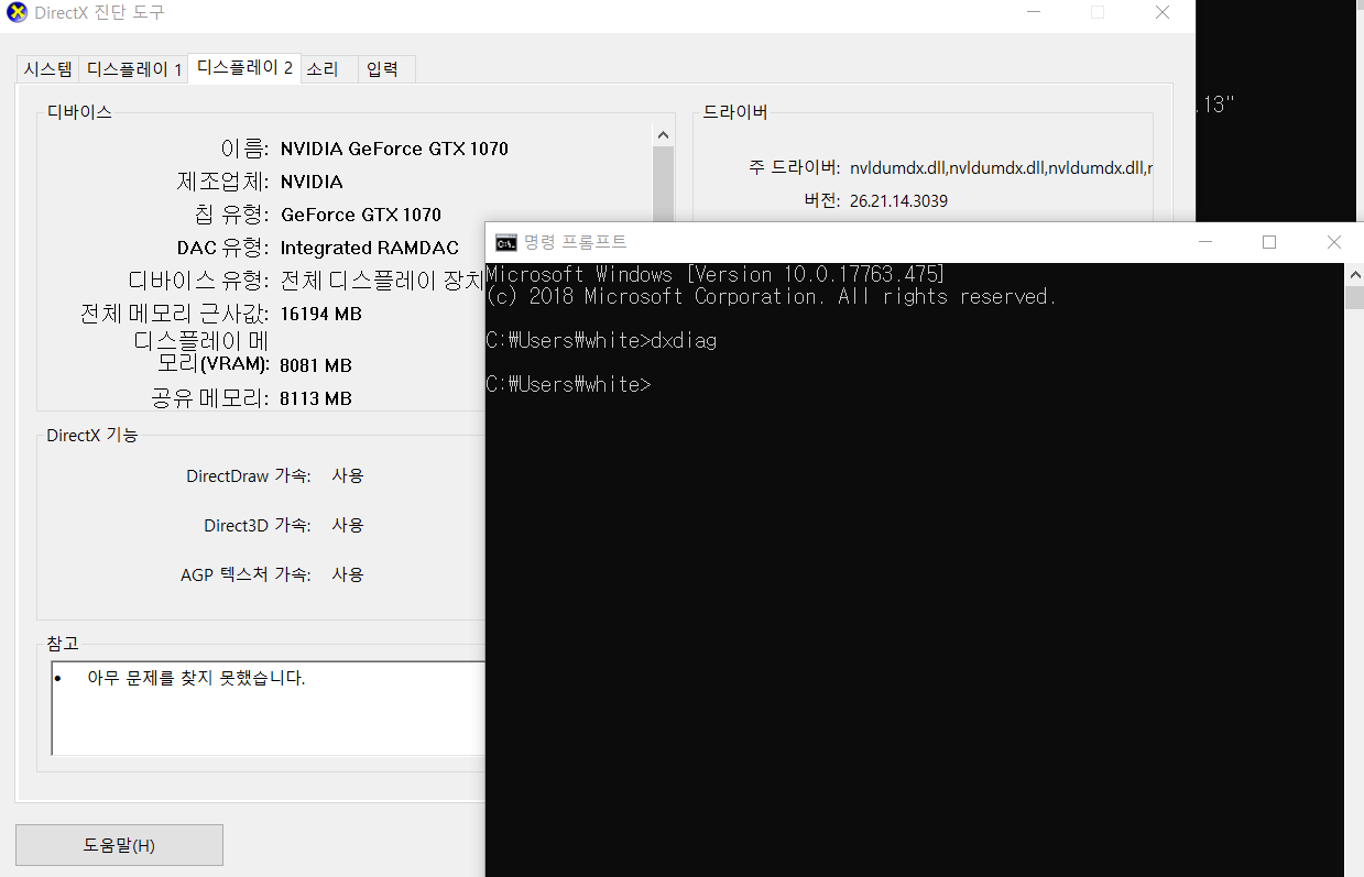 자신의 GPU가 어떤 것인지 모르시는 분들은 cmd를 키시고, dxdiag라고 쳐보십시요.