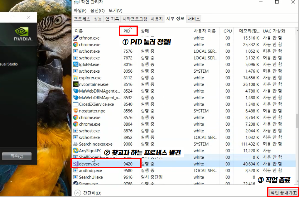 위의 그림처럼 진행하면, 비쥬얼스튜디오 프로세스를 찾아 종료할 수 있습니다.