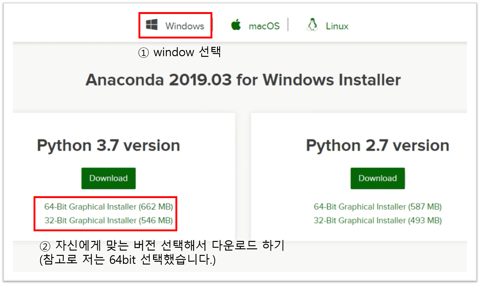 위의 페이지로 들어가셔서 자신의 OS에 맞는 아나콘다를 다운로드 하시면 됩니다.