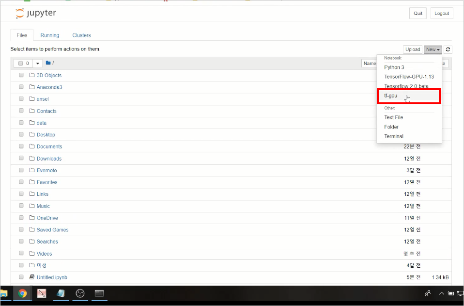 위와 같이 New 버튼을 눌러보시면, tf-gpu라고 셀렉박스가 뜹니다.