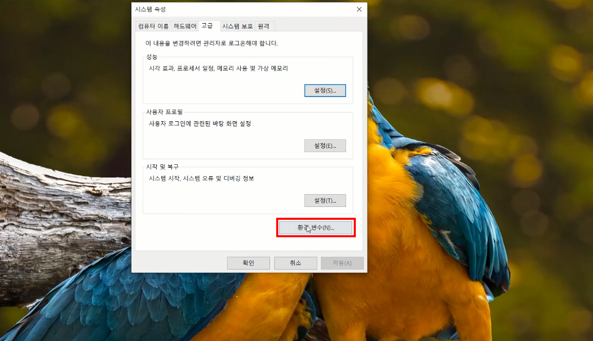 환경변수 버튼을 눌러 들어갑니다.