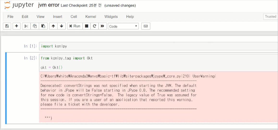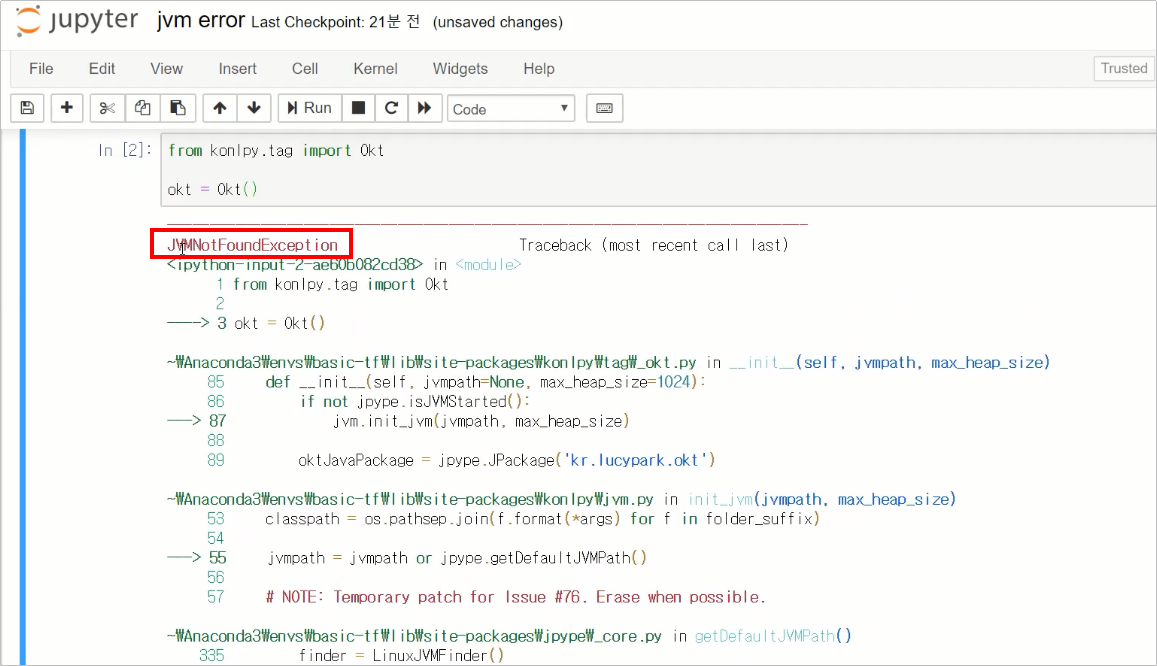 Konlpy 라이브러리 사용 중 나타나는 JvmNotFoundException 에러