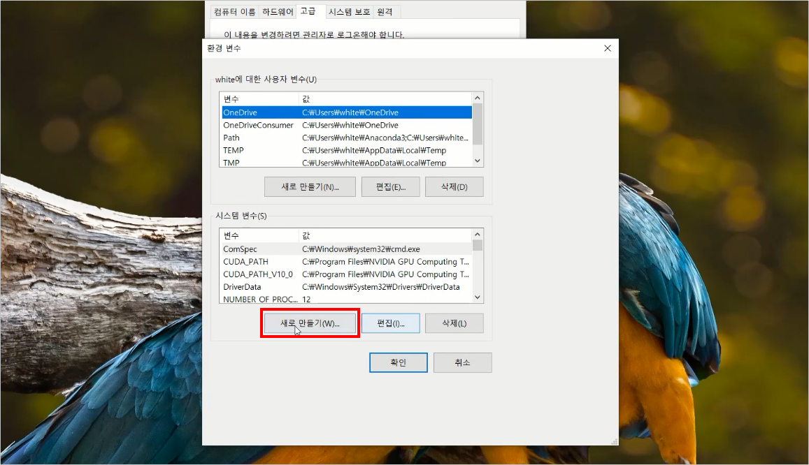 새로 만들기 버튼을 눌러 새로운 시스템 변수를 추가해줍니다.