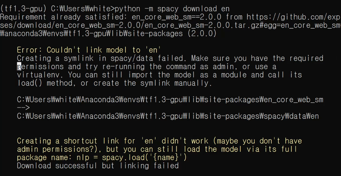 그런 다음, conda install spacy 명령어를 입력하여