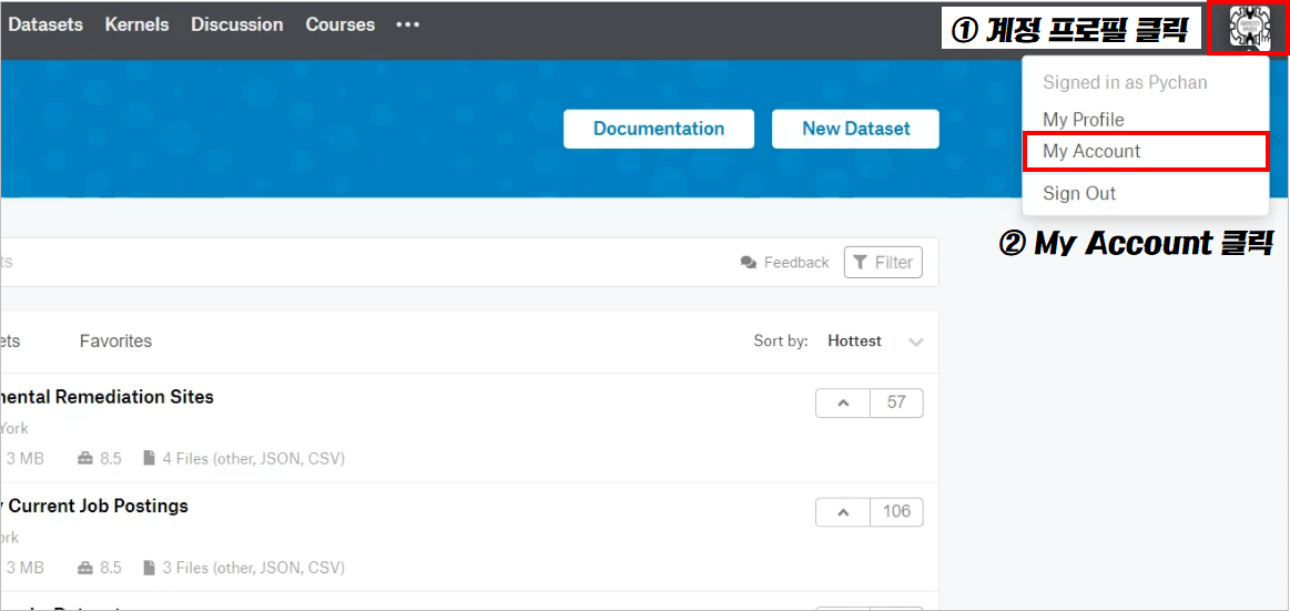 네 아무튼, 다 설치가 되셨으면 이제 kaggle 홈페이지에서