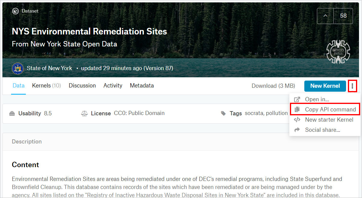 만일 홈페이지에서 본 데이터를 kaggle API로 다운받고 싶다면,