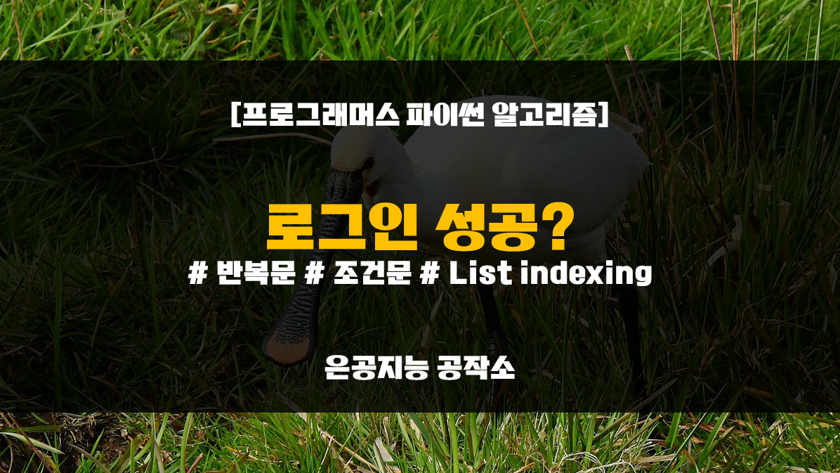 ★ 체크포인트① ★ list indexing을 이용한 id_pw 접근 id_pw는 대괄호로 묶여있는 자료구조로, 이러한 것을 python에선 list라고 부릅니다. list의 각 요소에 접근하기 위한 방법을 indexing이라고 부르는데요, 대괄호 안의 숫자로 각 요소에 접근할 수 있습니다. (ex- id_pw[0])
