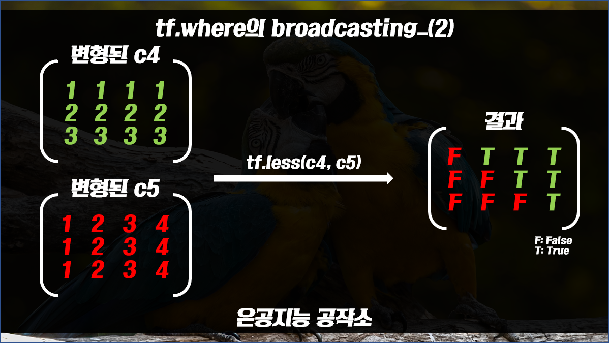 이제 브로드캐스팅된 텐서 c4, c5를 통해 tf.less 연산이 수행이 됩니다.
