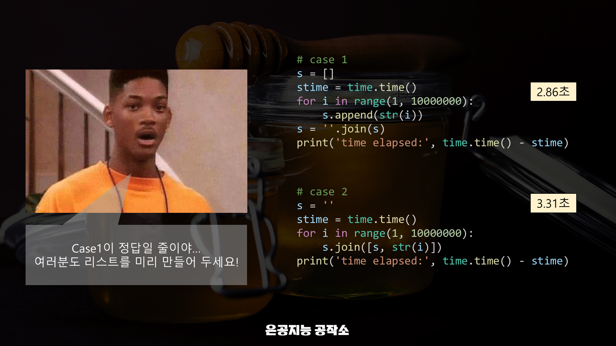 결론은 그냥 문자열을 +하는 것보다 join 함수를 쓰라는 것입니다.